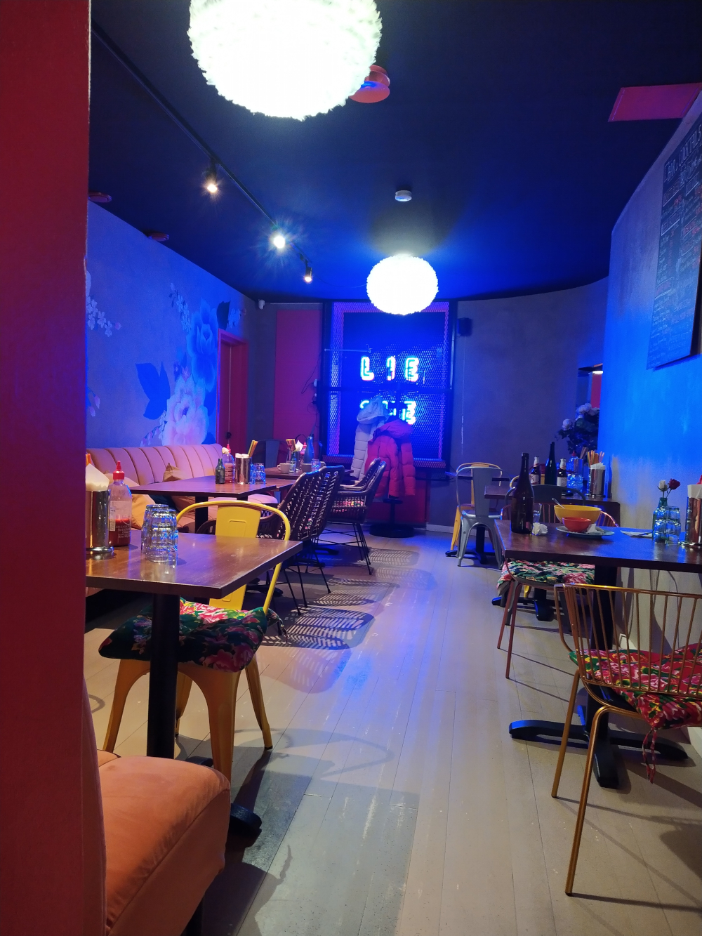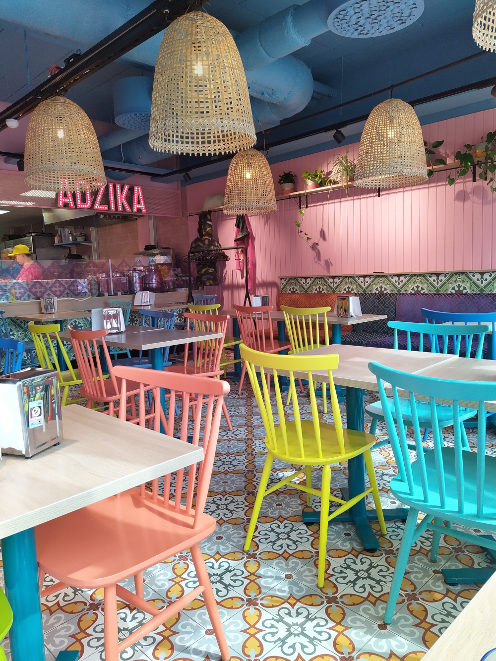 Värikäs ravintola. Piristys päivään! Lihameze ja hatsapurin päälle tehty juustoinen salamipizza. Tämä on itselleni lohturuokaa. Viime vuosina olen tarvinnut paljon lohtua tämän parantumattoman syövän vuoksi, ja kaikki tämä lohdutus on toden totta alkanut näkyä painossani, enkä nyt edes liioittele.